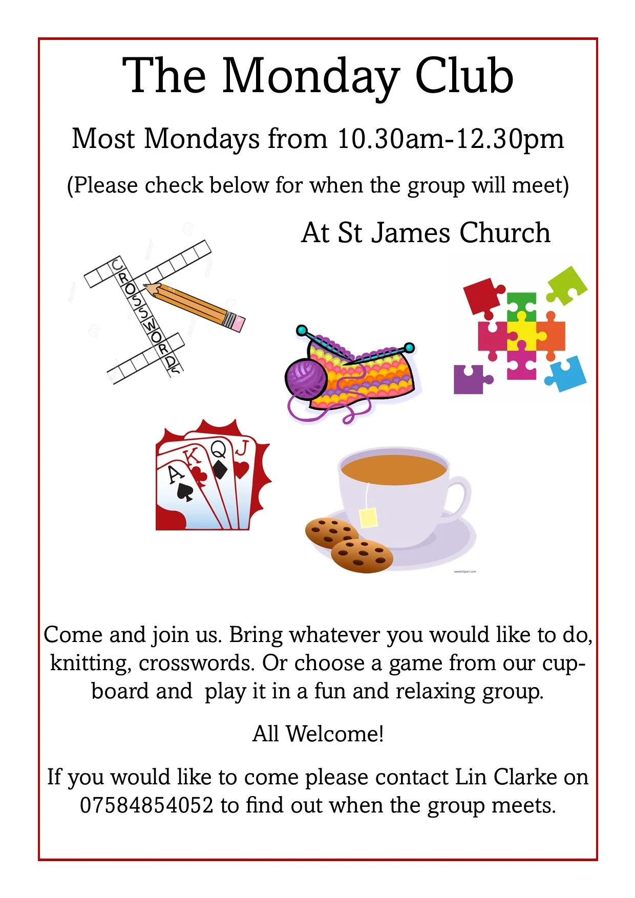 10.30am-12.30pm Monday Club - Please check with Lin as to whether the group is meeting on 07584854052